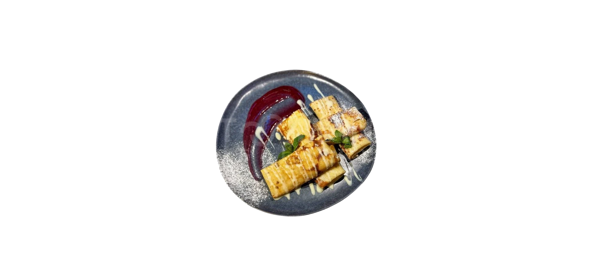 Серцем цієї страви є соковиті шматочки банану, які надають млинцям природної солодкості та тропічного аромату. Все це доповнюється насиченим згущеним молоком, яке додає ніжної кремової нотки та робить кожен шматочок справжнім задоволенням. Верхній шар прикрашений збитими вершками та посипаний цукровою пудрою, створюючи гармонійне поєднання смаків і текстур.