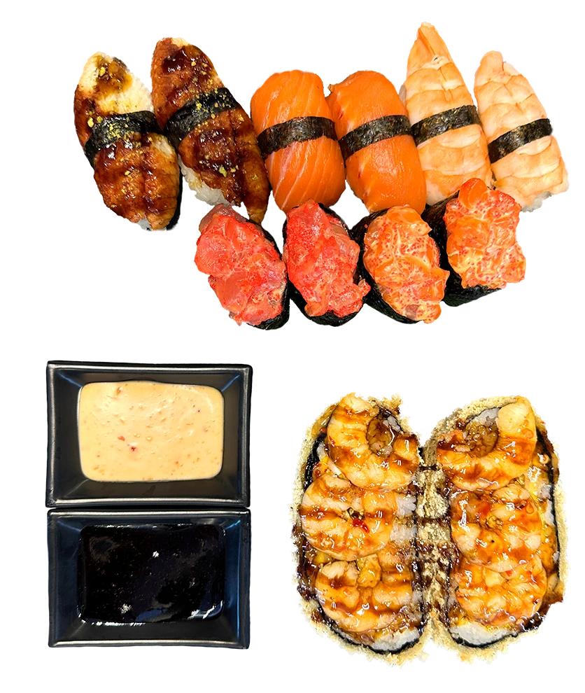 Склад: Суші-бургер з креветкою • Гункан з тартаром тунця • Гункан з тартаром лосося • Нігірі з лососем • Нігірі з креветкою • Нігірі з вугрем